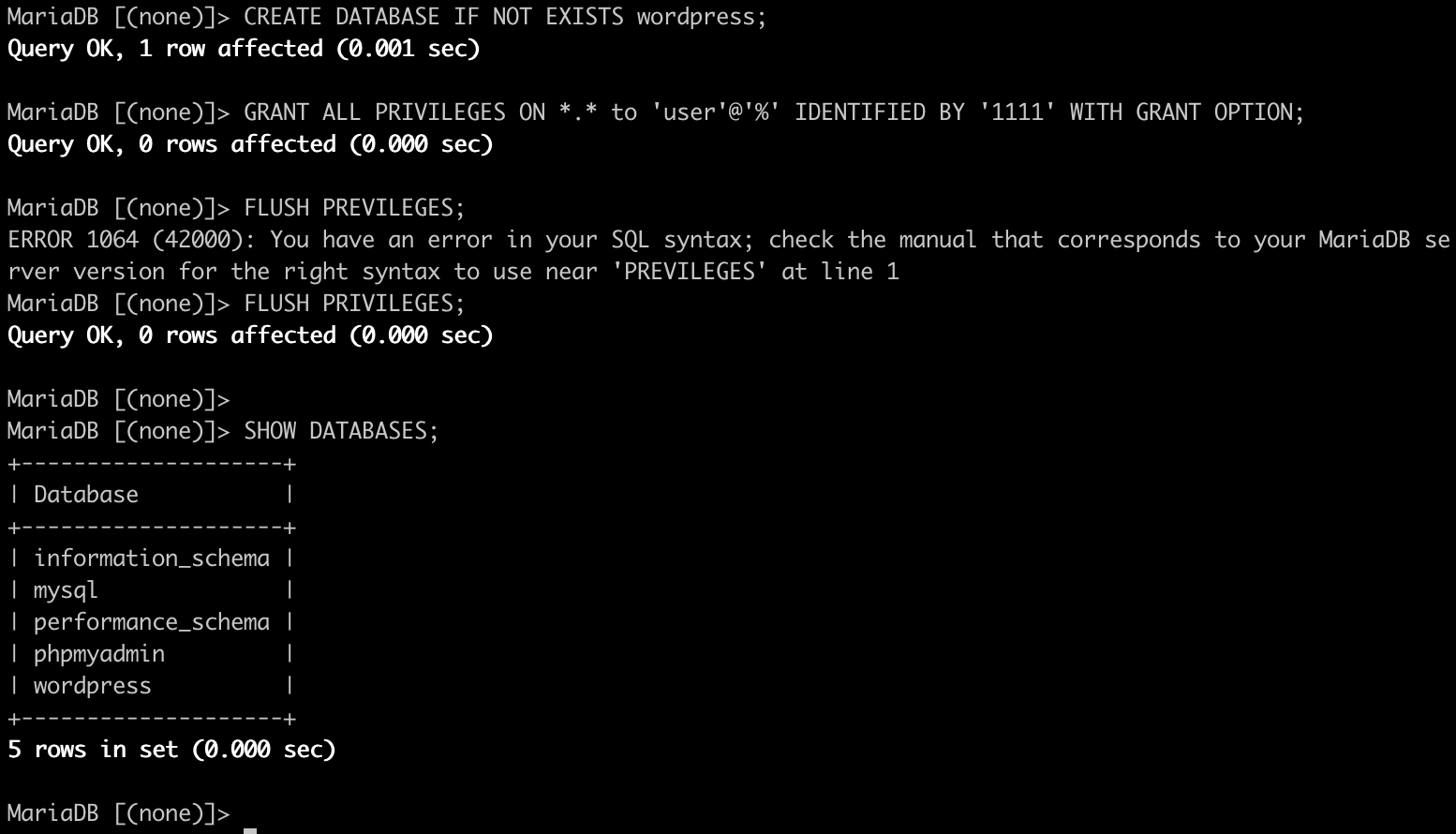 CREATE DATABASE IF NOT EXISTS wordpress; // 워드프레스를 위한 DB 만들기